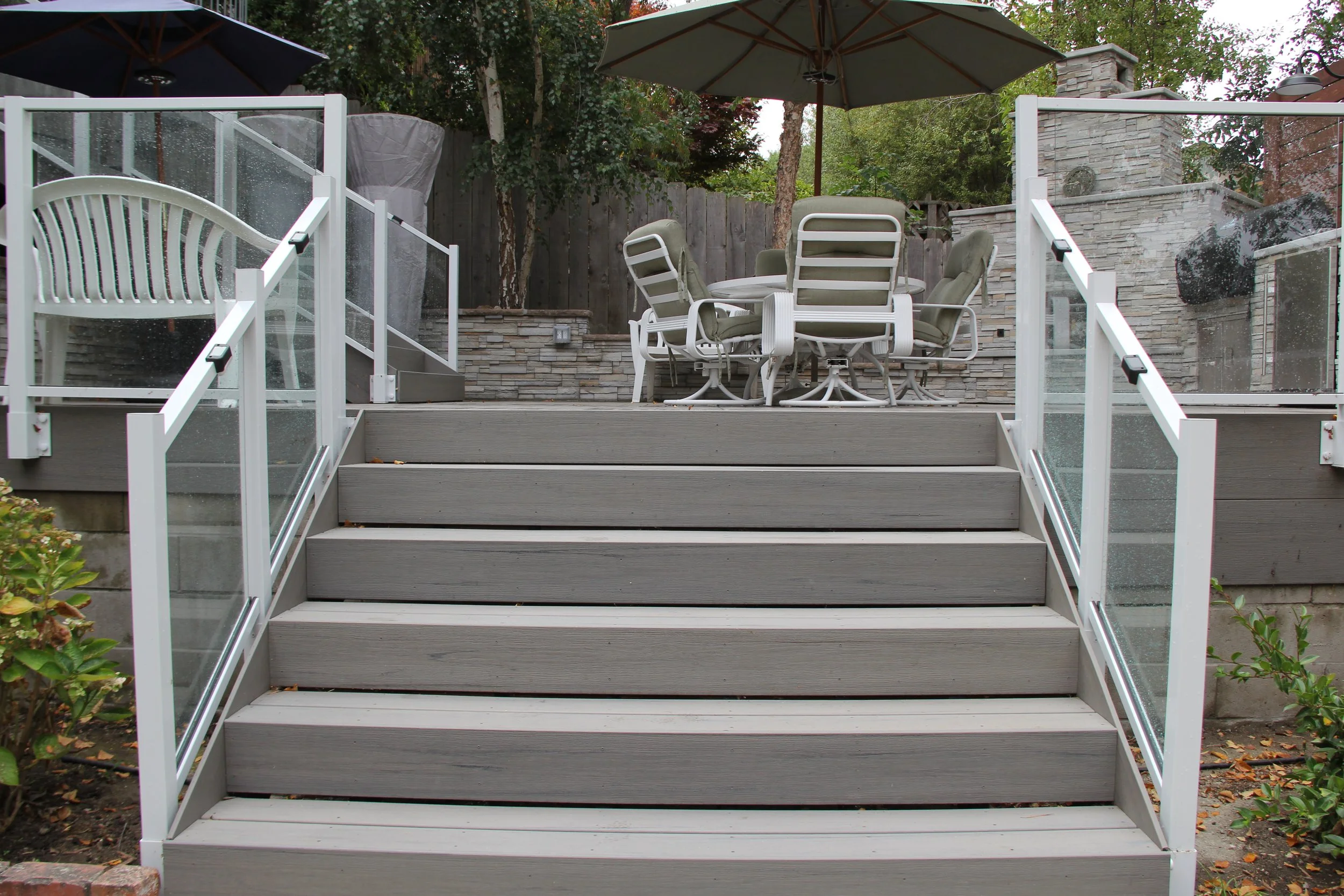 This custom two-level deck features TimberTech composite decking in the color Ashwood, offering a clean, modern look with long-lasting durability. The design includes sleek glass railings that open up the view while maintaining a contemporary feel. Our team also built the stone fireplace and custom grill station, creating a fully functional and stylish outdoor living space perfect for entertaining or relaxing year-round.