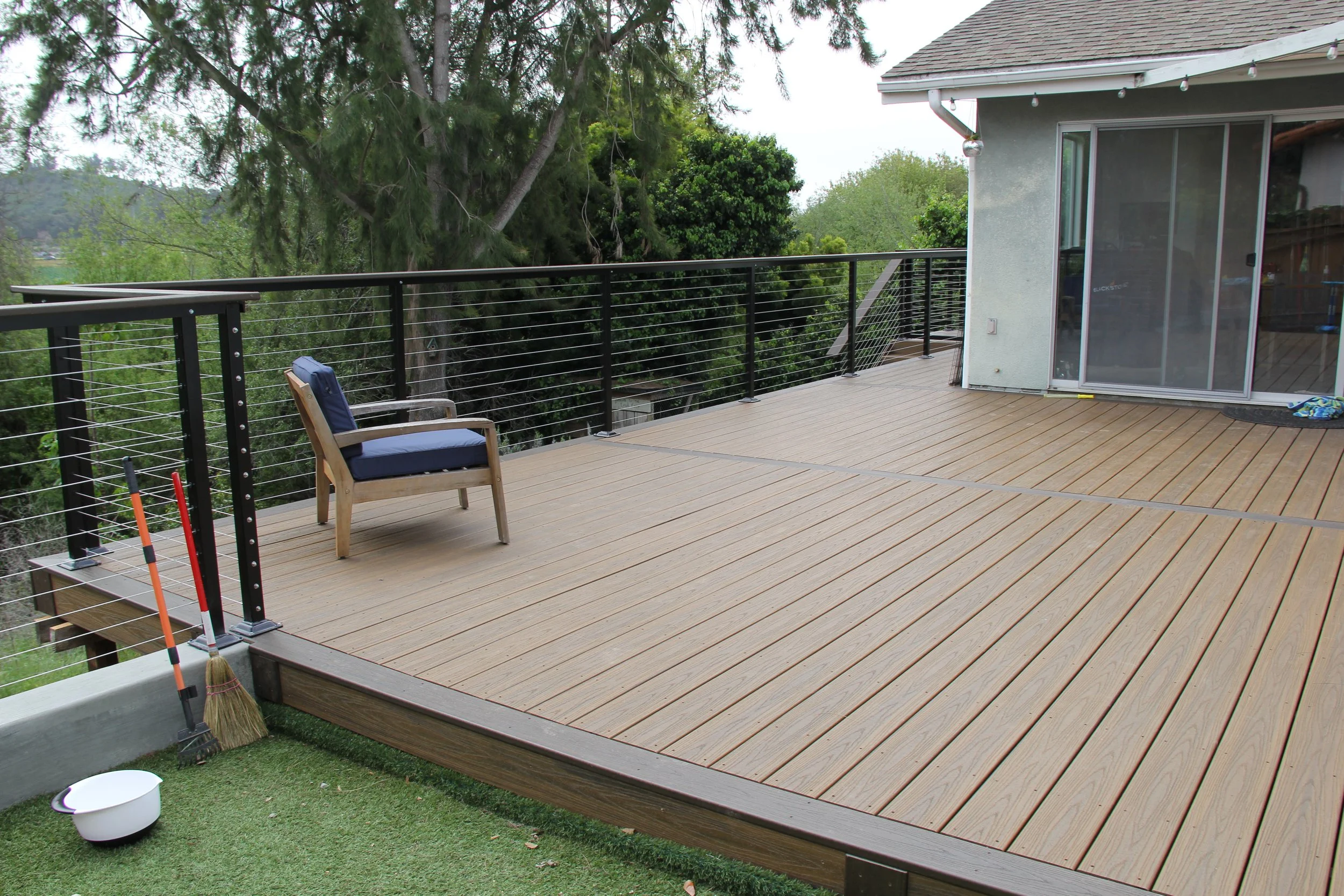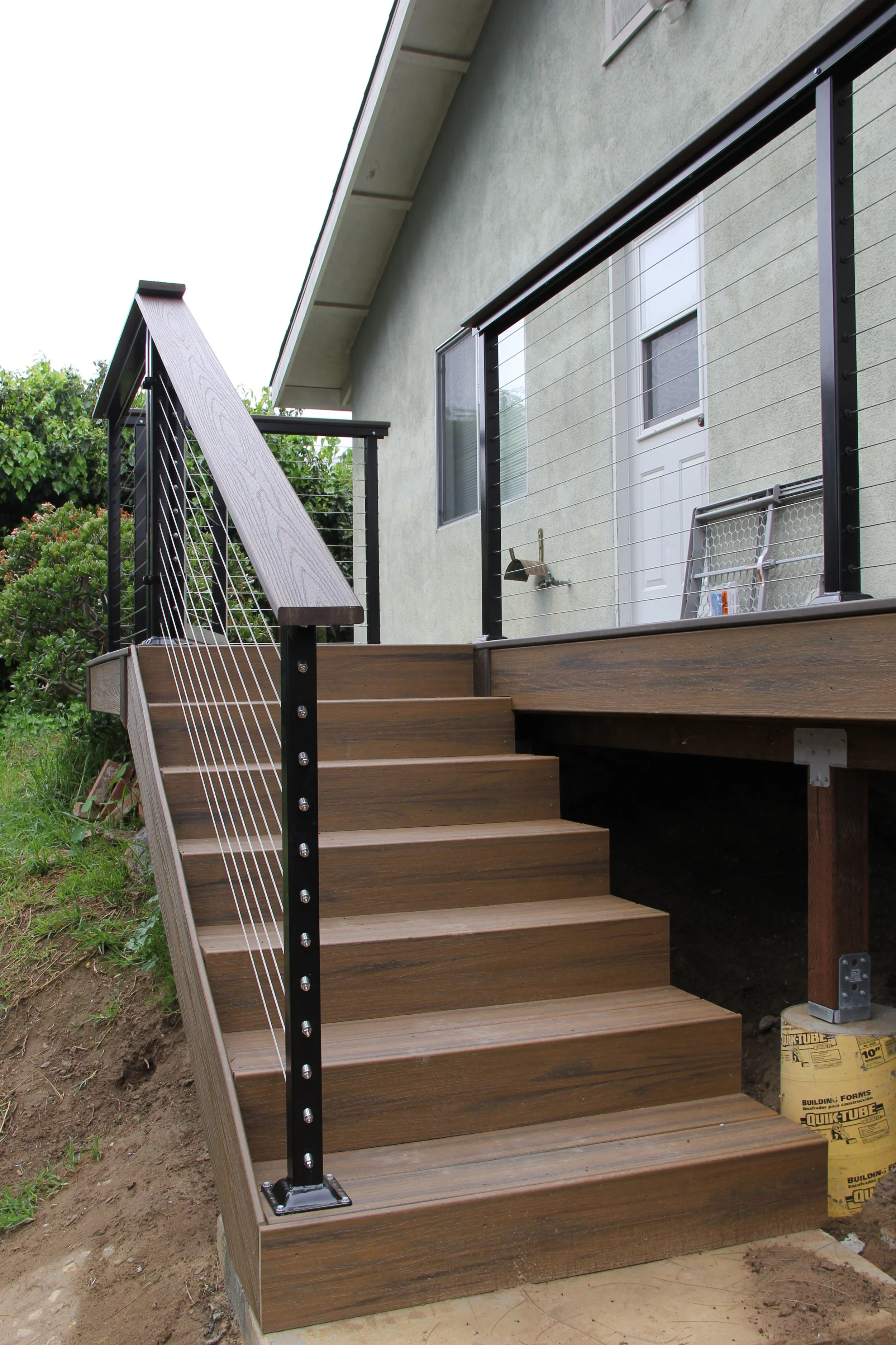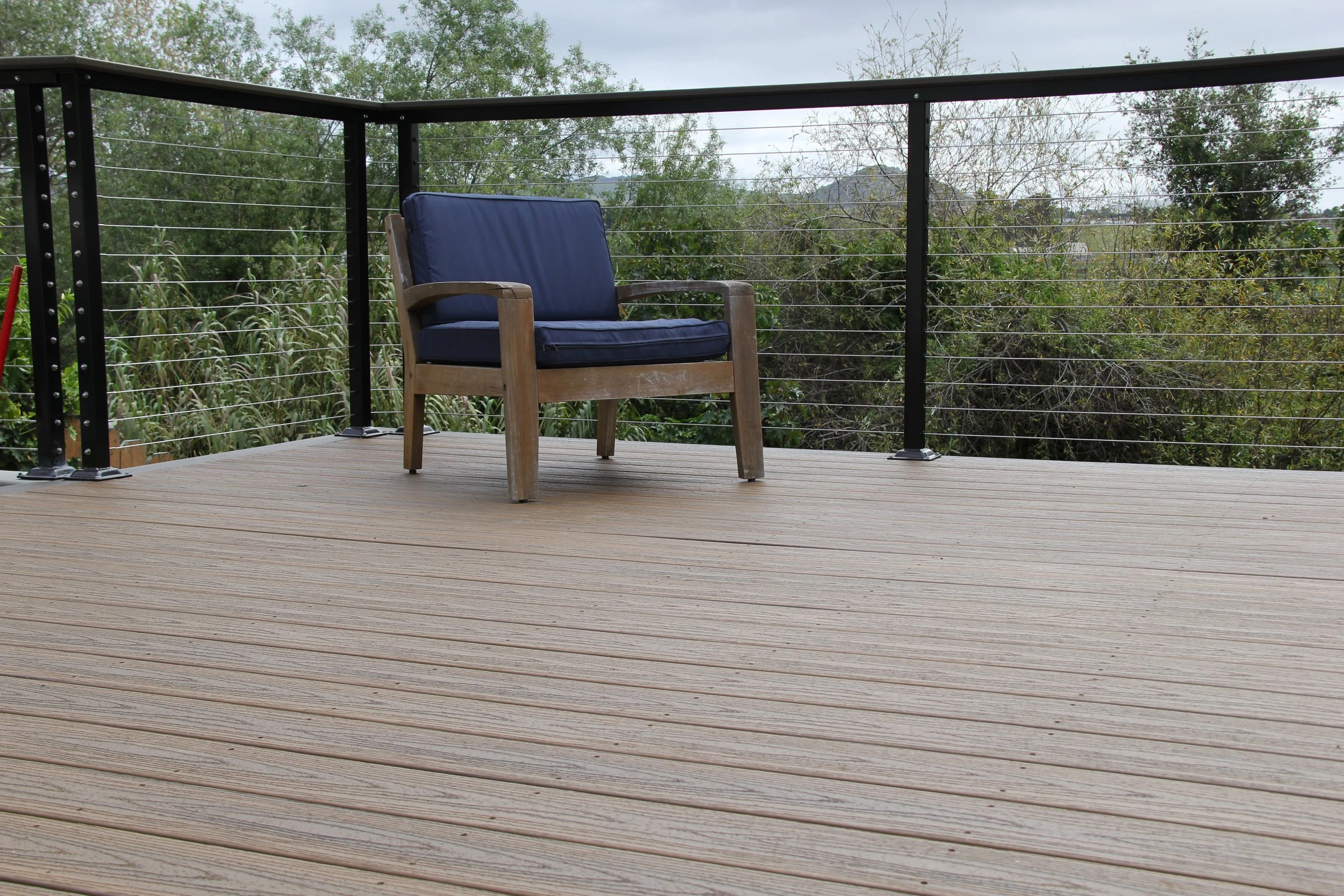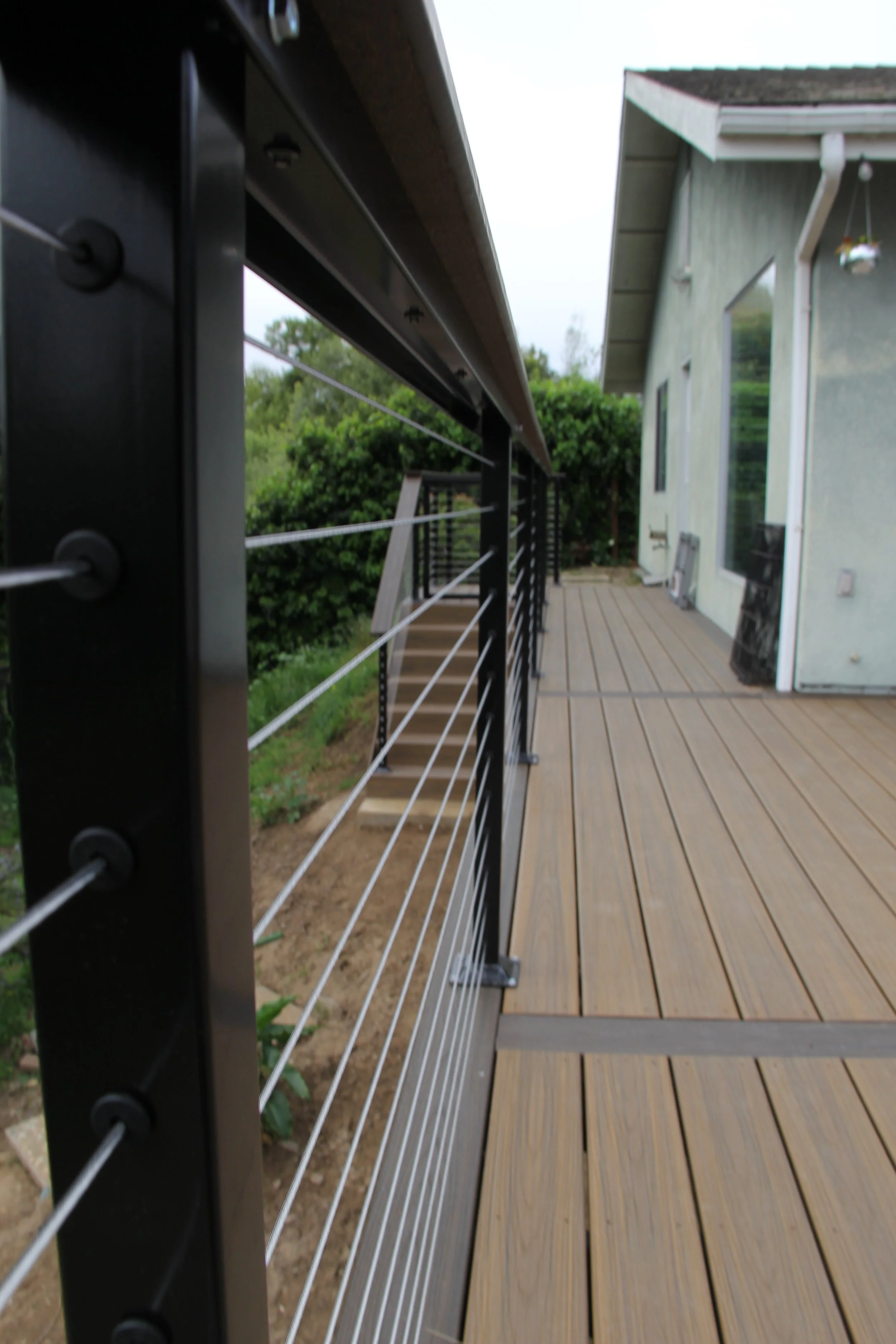 This deck features Trex decking in the color Havanna Gold and Spiced Rum. A modern elevated deck with sleek railings, a spacious overview, and stairs leading down to a private lower level — perfect for both relaxing and entertaining.
