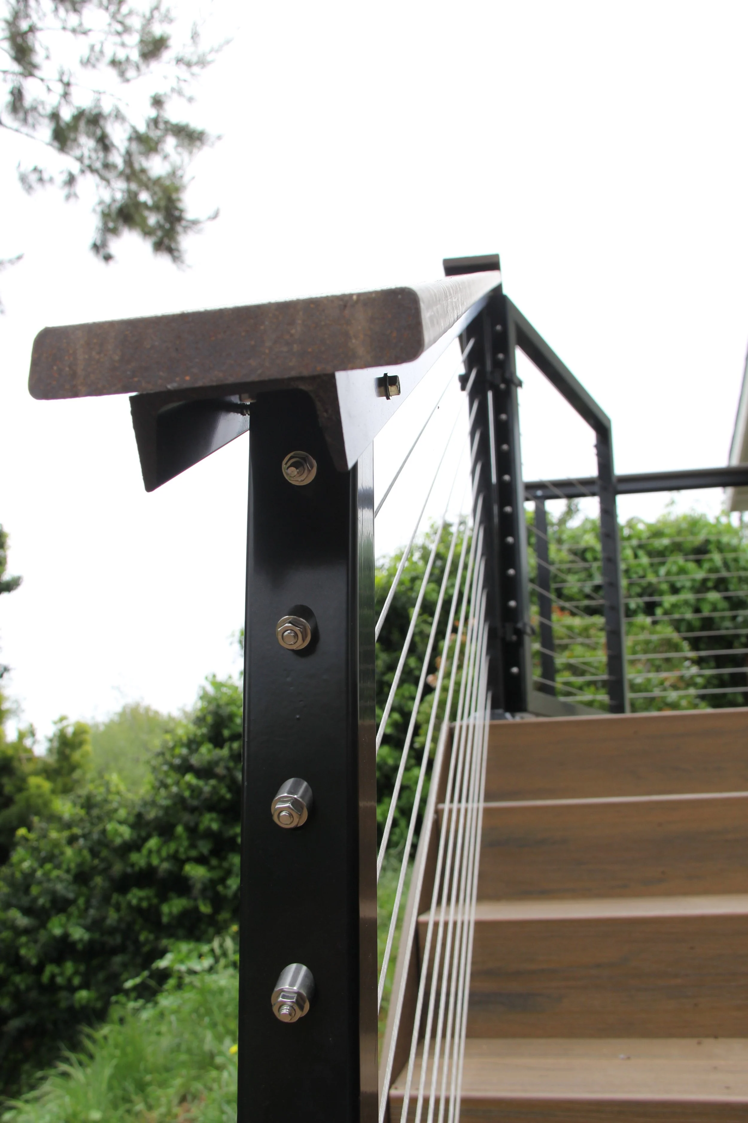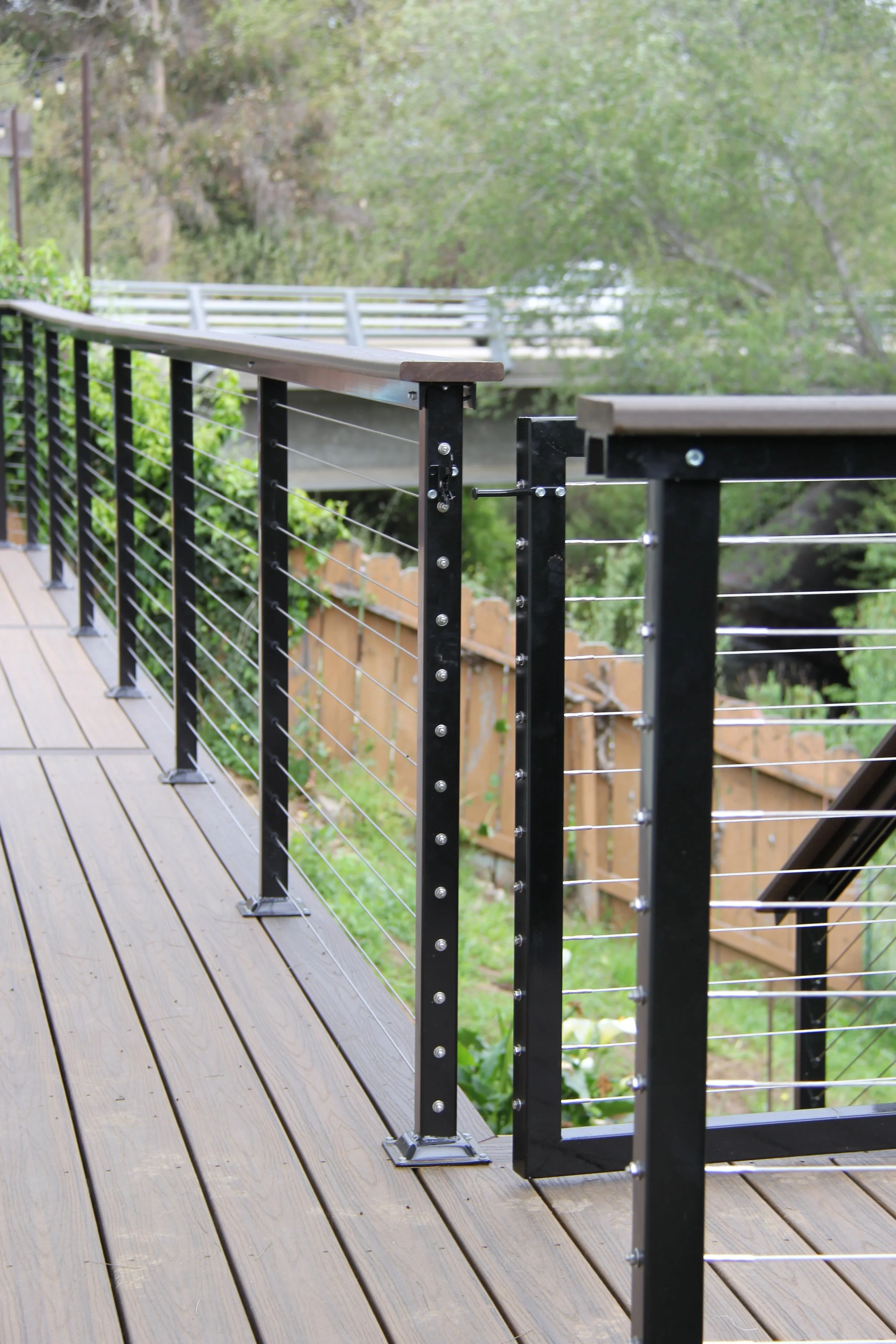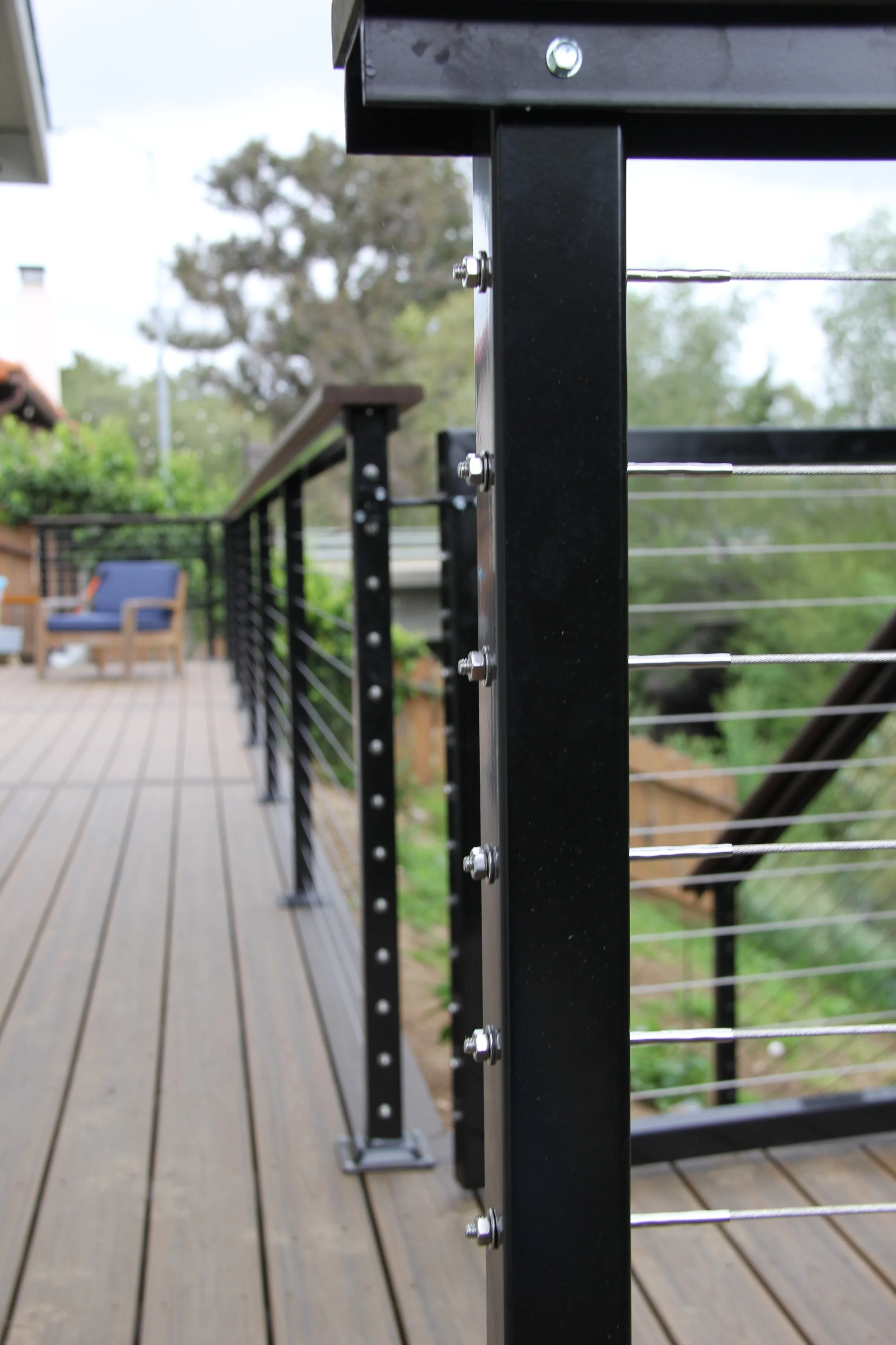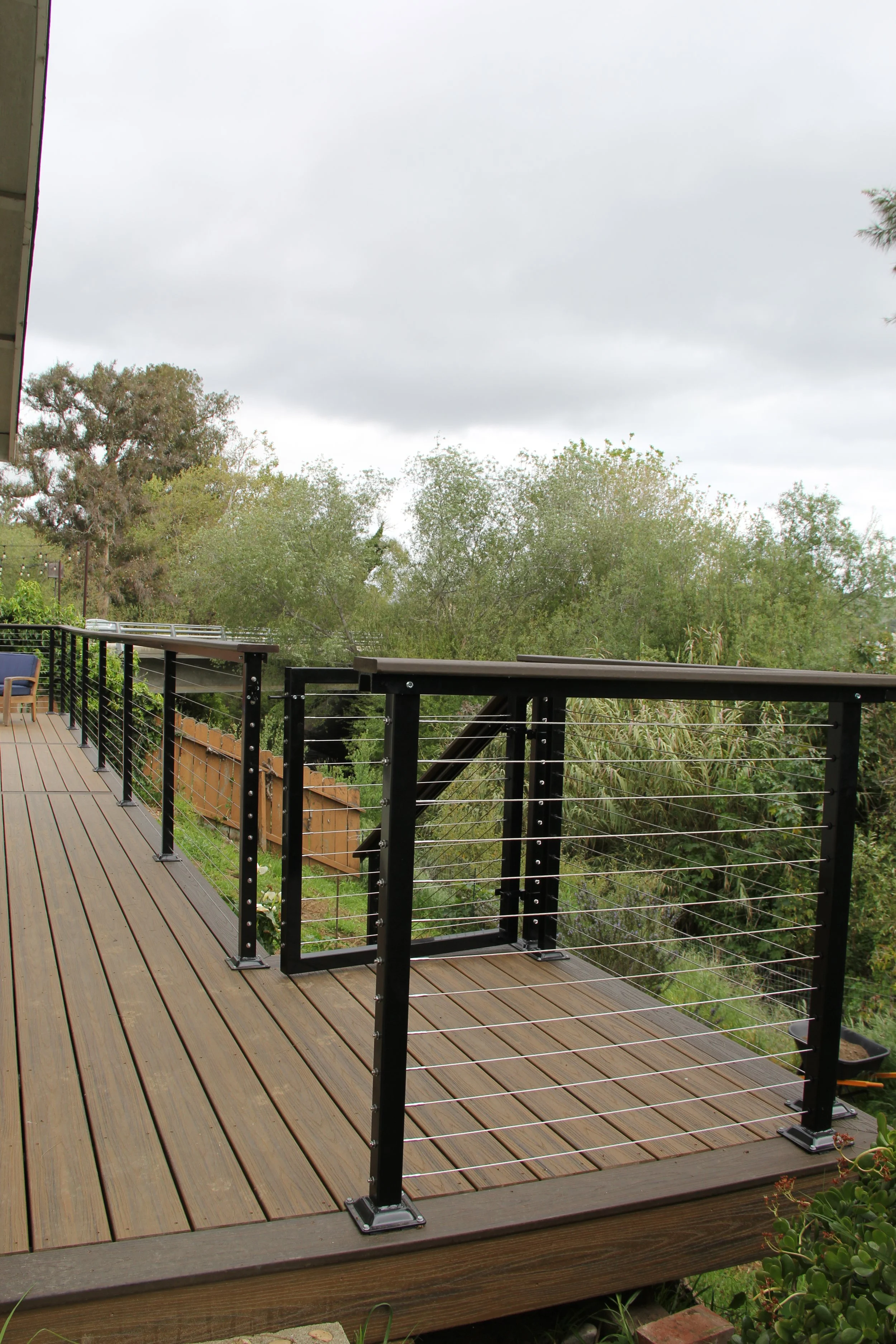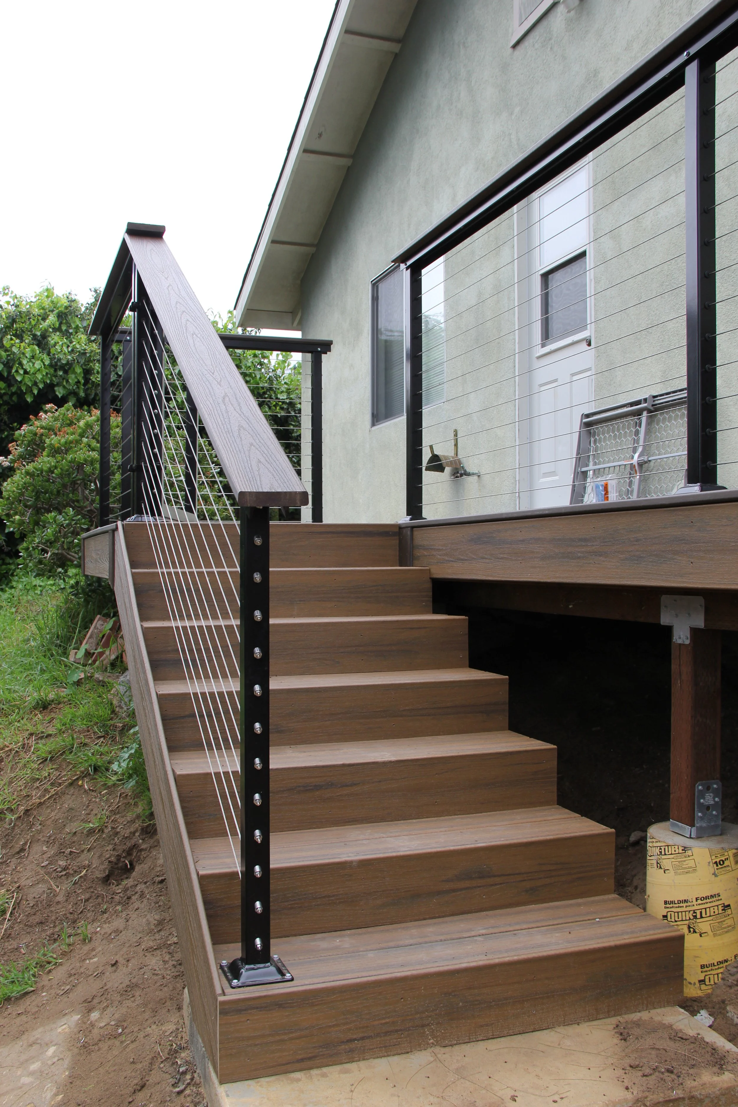 This deck features Trex decking in the color Havanna Gold and Spiced Rum. A modern elevated deck with sleek railings, a spacious overview, and stairs leading down to a private lower level — perfect for both relaxing and entertaining.