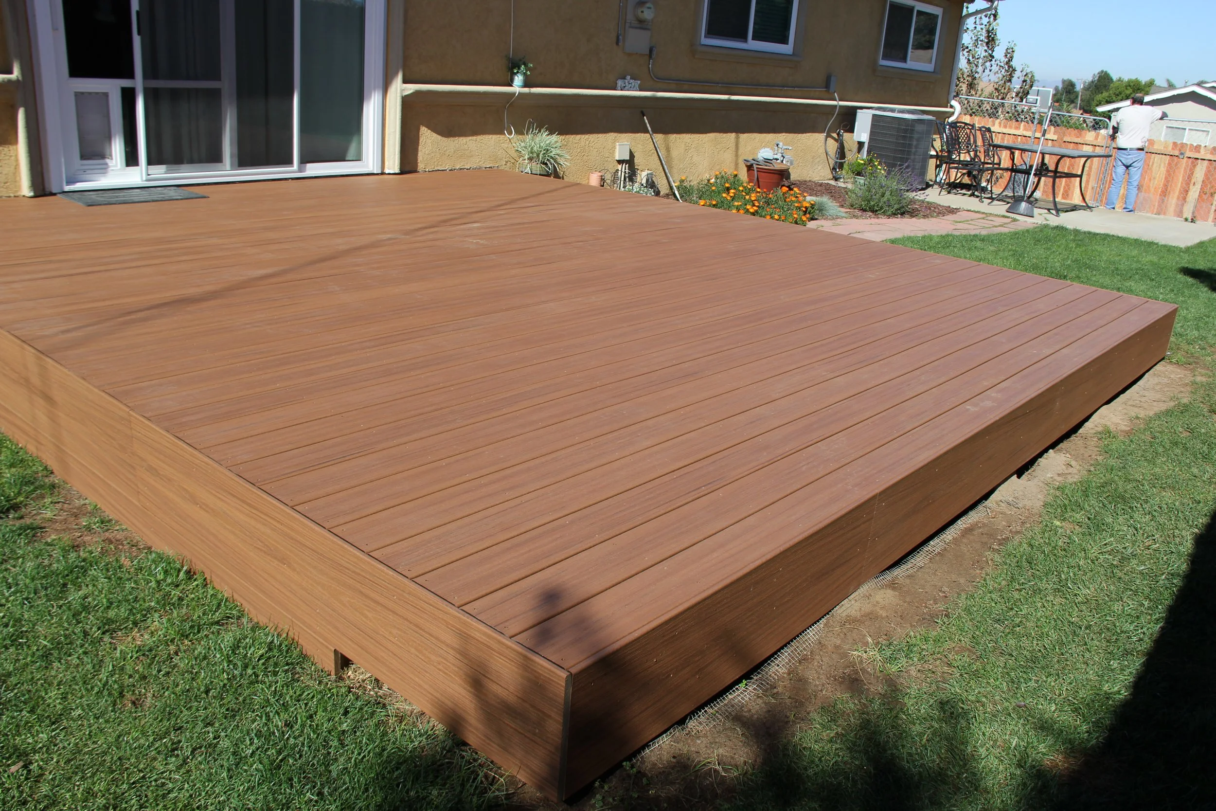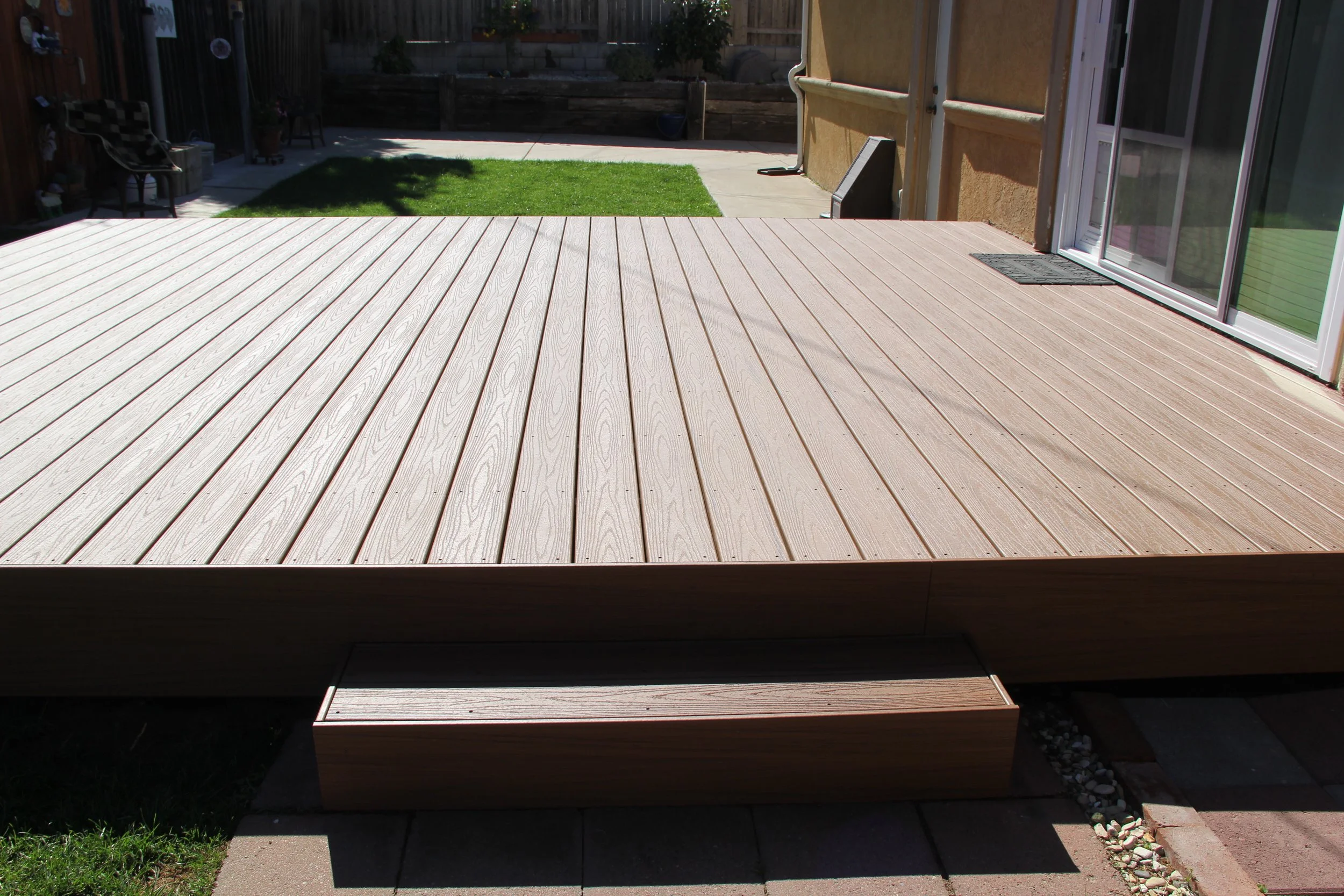 This custom low-profile deck was built using Trex Tiki Torch composite decking, a premium choice known for its warm golden tones and tropical woodgrain finish. The seamless, modern design features hidden fasteners for a clean surface and a single-step transition from the patio door to the yard.